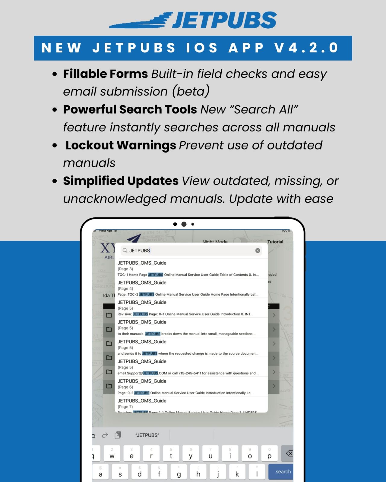USA – JETPUBS has officially released Version 4.2.0 of its iPad App, bringing a host of new features tailored to the needs of pilots, maintenance teams, and operational personnel. Built on direct user feedback, the update enhances the way aviation professionals manage manuals and workflows across daily operations—whether in the cockpit, on the ramp, or in the office.