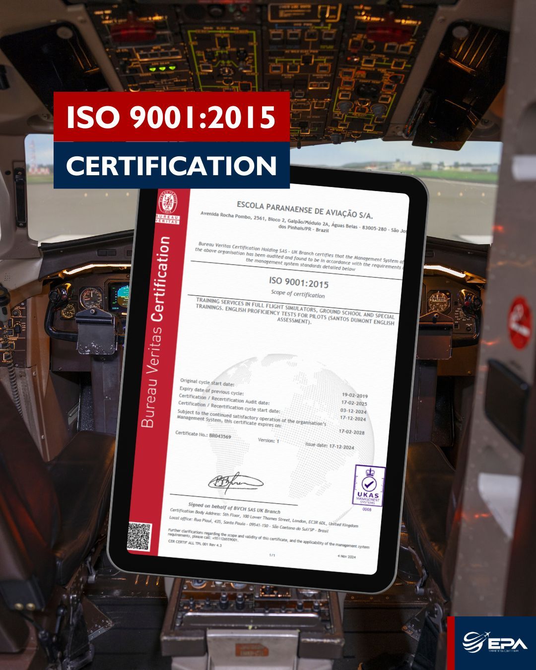 The ISO 9001:2015 certification ensures that EPA’s processes meet strict international quality standards.Recertification covers EPA’s core activities:Training services using Full Flight Simulators.Ground school and specialized training courses.Administration of English proficiency tests for pilots, such as the Santos Dumont English Assessment.EPA has held the ISO 9001 certification since 2012, demonstrating a long-standing dedication to quality in aviation training and operations.