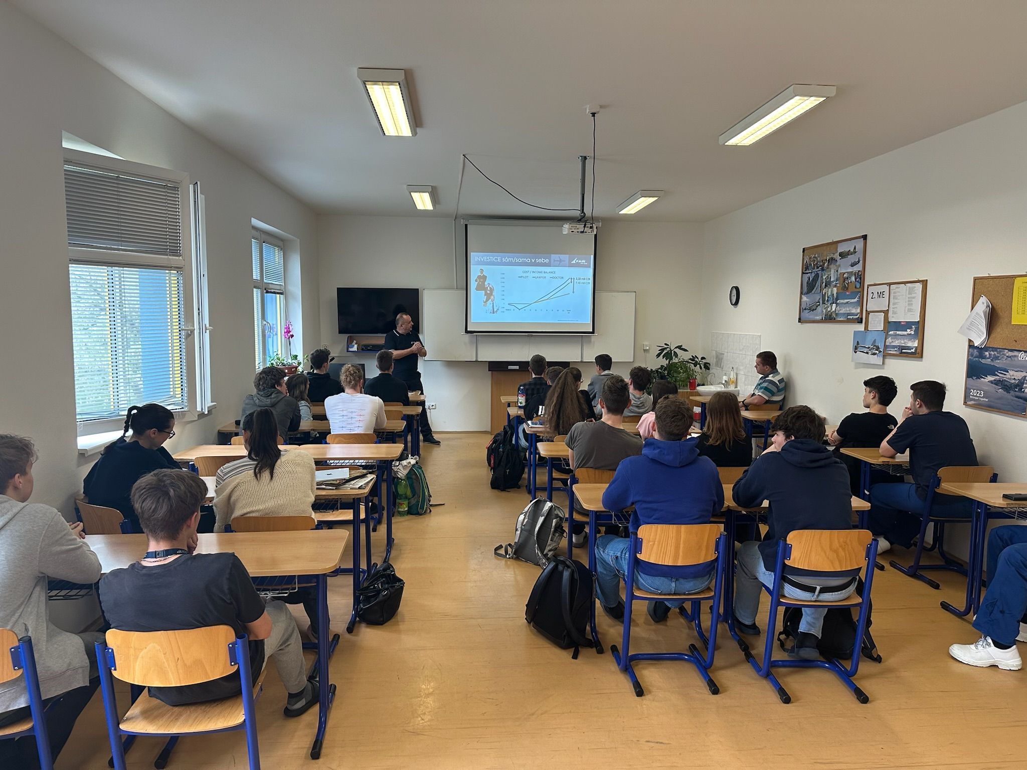 Miroslav Srnec, Head of Training, and Matěj Mrázek, Flight Training Sales Manager, represented F AIR during the visit.The session covered the structure and phases of professional pilot training, the daily life of a student pilot, and career opportunities post-graduation.