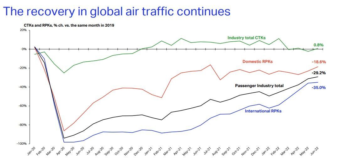 Global domestic traffic in June 2022 was 81.4% of the June 2019 levels.Global international traffic in June 2022 was 65% of June 2019 levels.