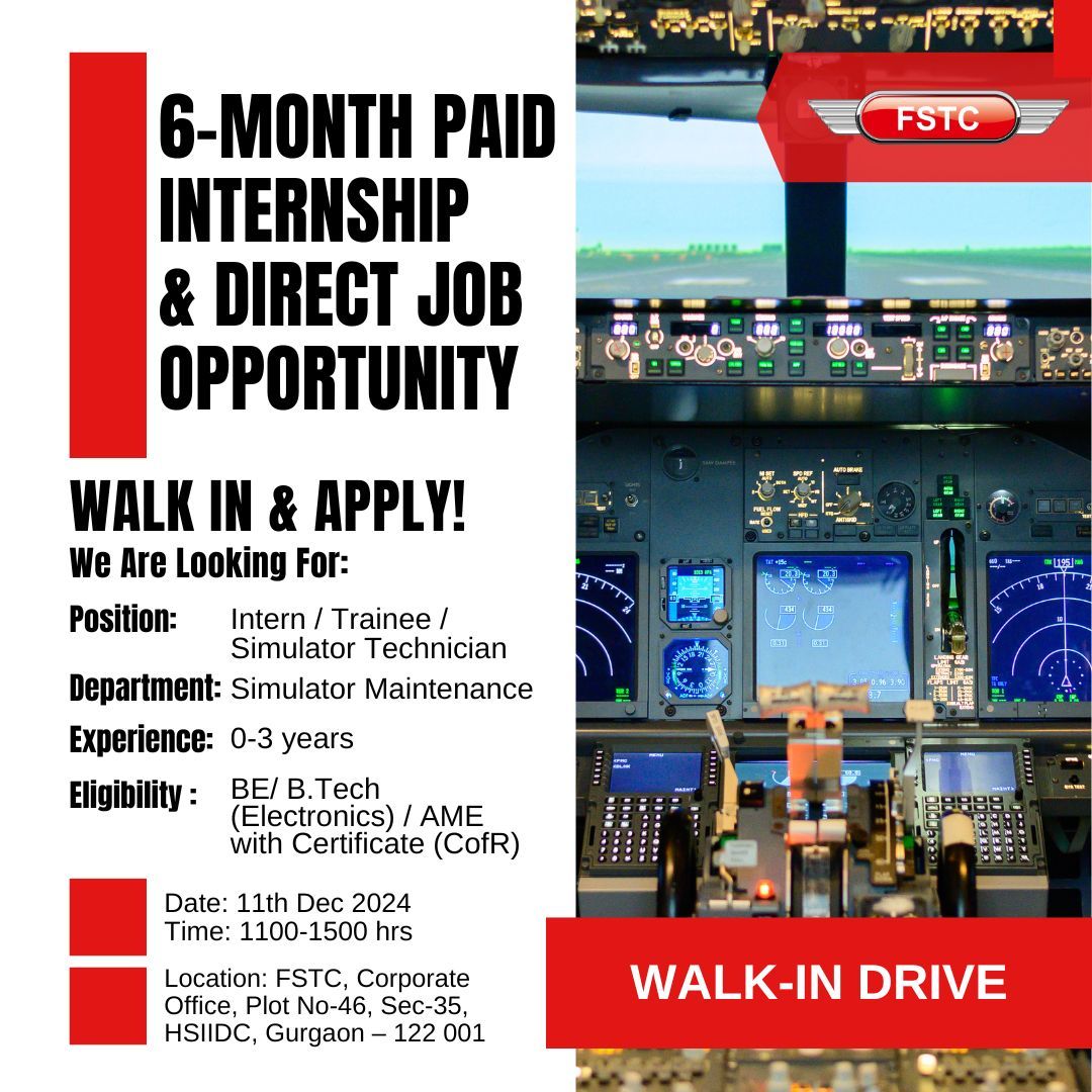 Gurgaon, India–FSTC, an Indian aviation training group operating both flight schools and full flight simulator training centers, has announced a 6-month paid internship and direct job opportunities for Interns, Trainees, and Simulator Technicians in the Simulator Maintenance department. The program is aimed at individuals seeking to build a career in the aviation industry through hands-on technical experience.