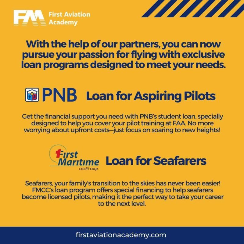 The PNB Loan for Aspiring Pilots is crafted specifically for FAA trainees, enabling students to cover the costs of their pilot training through a student loan package.First Maritime Credit Corporation offers a unique loan program designed for seafarers seeking to transition into aviation. This financing solution supports seafarers in their pursuit of a pilot license, making the career shift more attainable and aligning with FAA’s mission to open new opportunities in the field of aviation.