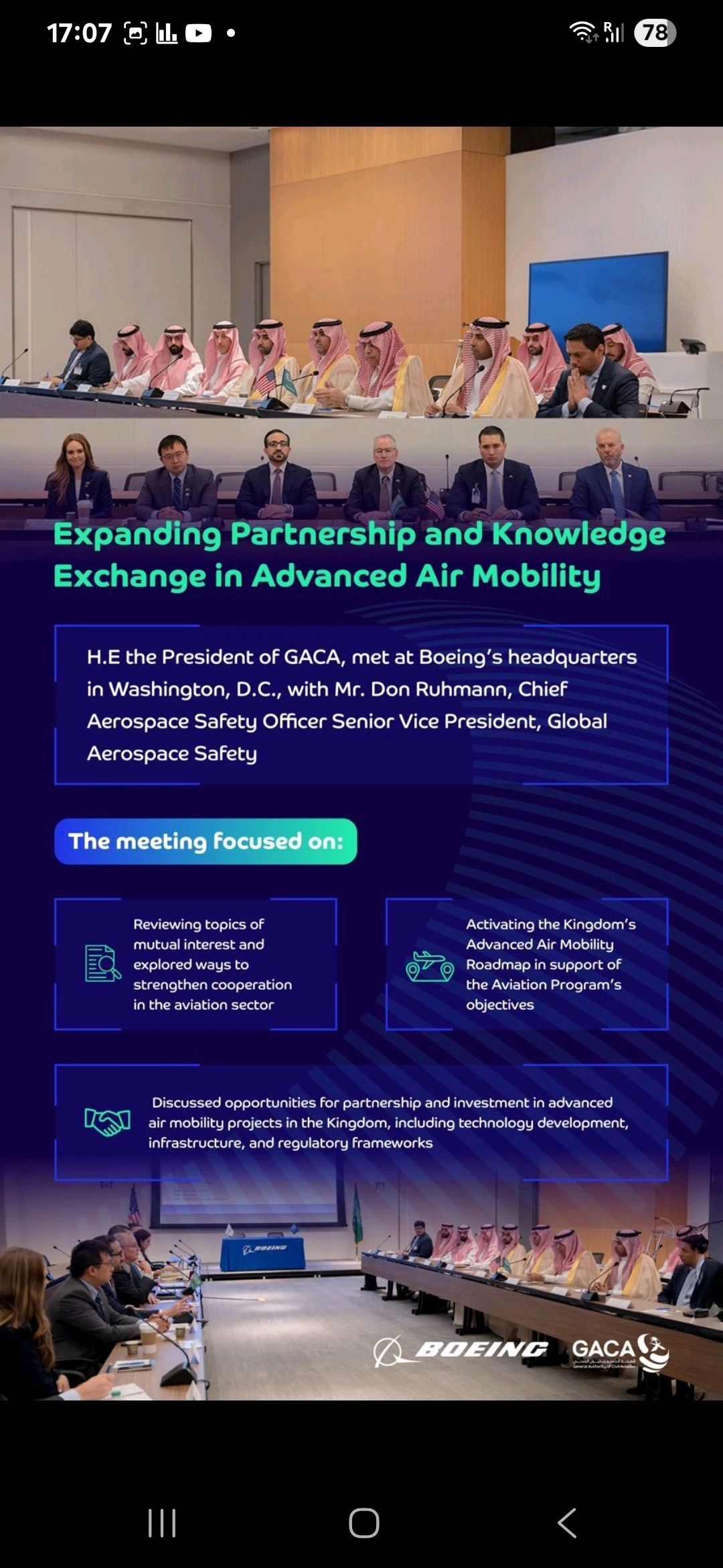 - The MoU was signed during a high-level meeting at Boeing’s Long Bridge office in Arlington, Virginia, between H.E. Abdulaziz Al-Duailej, President of GACA, and Mr. Don Ruhmann, Chief Aerospace Safety Officer and Senior Vice President of Global Aerospace Safety at Boeing.
