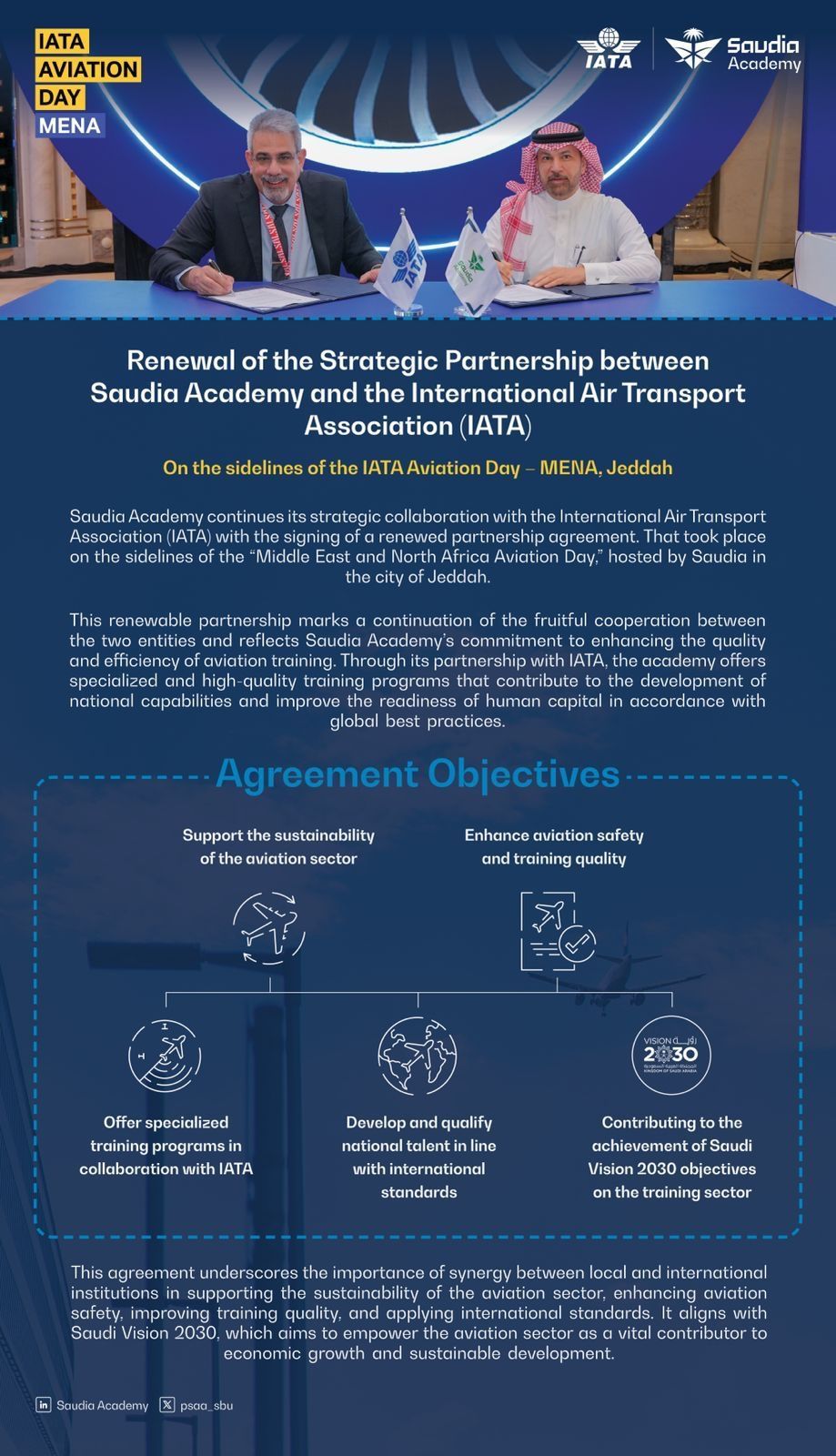 Jeddah, Saudi Arabia–Saudia Academy, the aviation training arm and full flight simulator training center of the Kingdom’s national carrier Saudia,continues its strategic collaboration with the International Air Transport Association (IATA) with the signing of a renewed partnership agreement. The signing took place on the sidelines of the “Middle East and North Africa Aviation Day,” hosted by Saudia in the city of Jeddah.