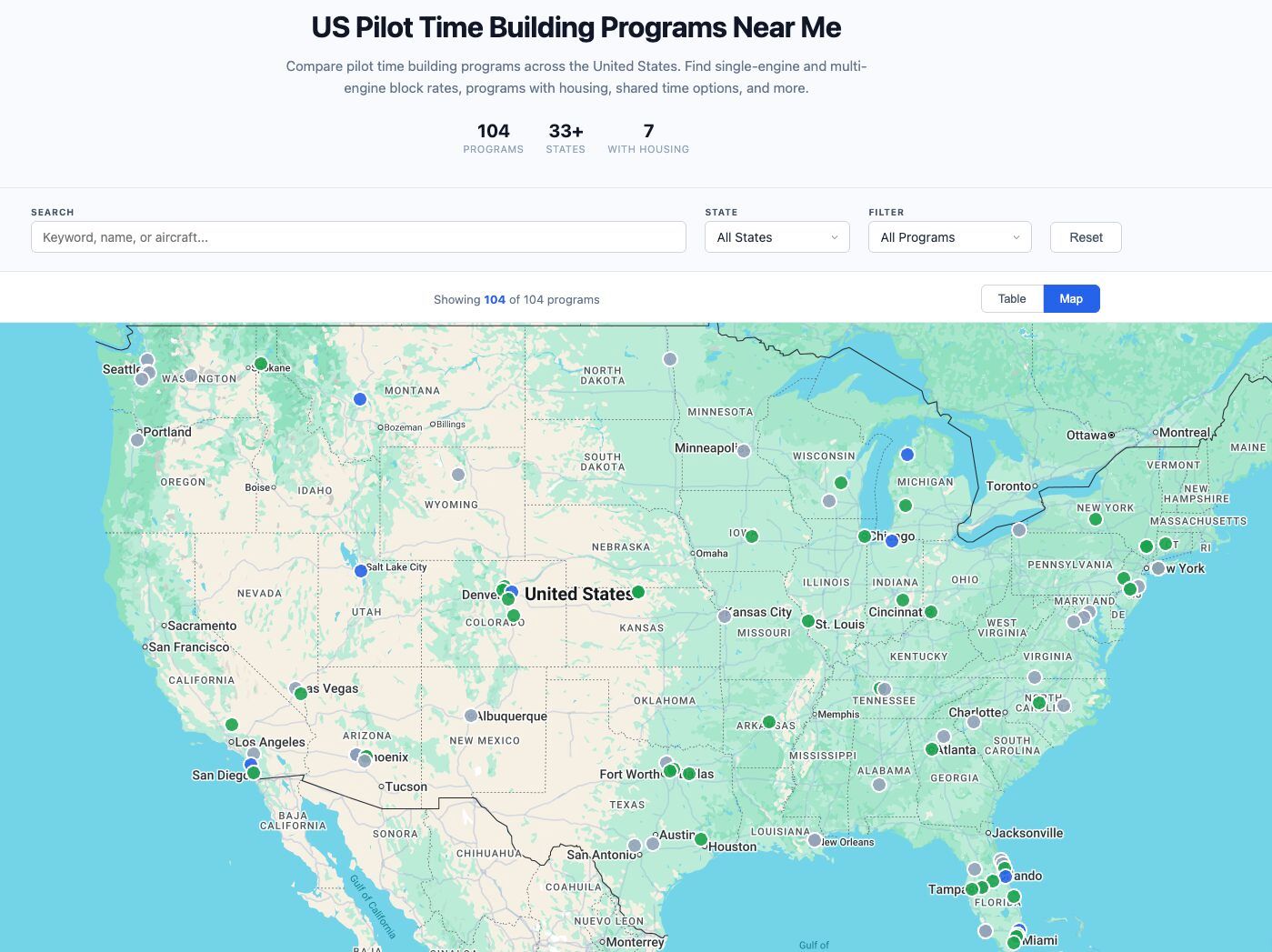- The directory, accessible at time-build.skyfareracademy.com, lists single-engine program's from $23/hr and multi-engine program's from $160/hr, with search and filter functionality by state, aircraft category (single-engine/multi-engine), shared time availability, housing options, and price.