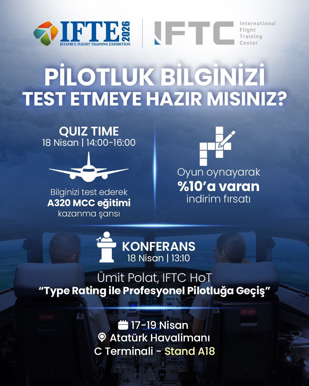 Türkiye – International Flight Training Center (IFTC), the independent full flight simulator training centre group and a member company of Gözen Holding, is exhibiting at the Istanbul Flight Training Exhibition (IFTE) 2026 at Atatürk Airport Terminal C from 17–19 April, with attendees offered the opportunity to win A320 MCC training and access discount opportunities at Booth A-18.